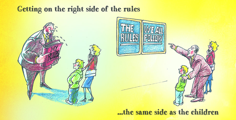 This poster reminds us that the rules are owned by the school, not by any individual. They apply to children and to adults. In fact, most of the rules are those governing the staff. In practice, those applying to the children also apply indirectly to staff, because they are required to apply the rules in the specified way.